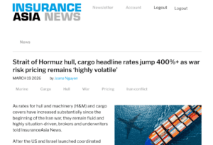 Client Rebekah Khew, director, Vivace Insurance Partners, APA, contributes her expertise for this article in Insurance Asia News about the volatility of war risk pricing, especially in the Strait of Hormuz, and addresses the impact of geopolitical tensions on maritime insurance rates and the challenges faced by insurers and ship operators.